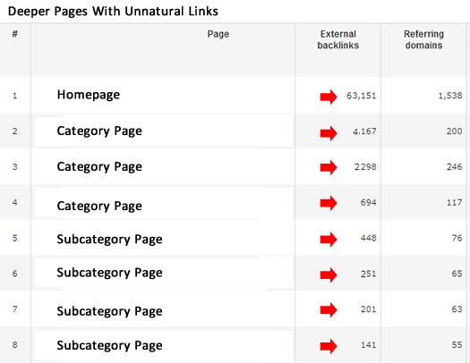 Aşağıdaki resimde “Deeper Pages With Unnatural Links“ yani Google Penguin 2.0 gözünde doğal olmayan bağlantılara sahip bir web sitesinin örnek link profilidir.Web siteniz böyle bir link profiline sahip ise %100 tehlikededir.Bugün olmasa bile yarın..